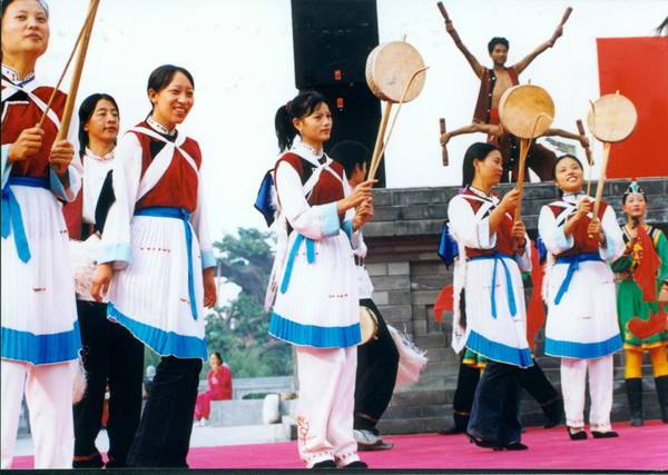 麗江壩區(qū)一帶的納西族婦女服飾,自清改土歸流以來有了很大變化,特別是自麗江發(fā)展旅游經(jīng)濟以來,服飾變化呈跨越式發(fā)展。從“毛繩為裙”改為穿褲子,整個服飾及其配飾講求美觀精致;傳統(tǒng)上是身著淺色系大襟繡邊長褂,外加紅色氆氌繡飾以精美七星羊皮披肩(還有的加日月圖案),披肩帶上繡有蜂蝶圖案,象征意喻納西族婦女勤勞能干,像蜜蜂一樣為了生活而勤勤懇懇。