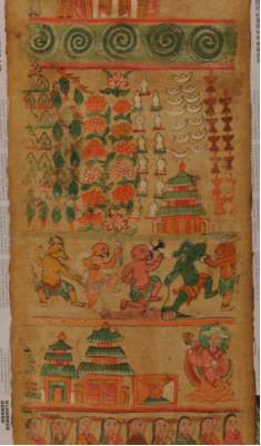 納西族東巴教的長(zhǎng)幅布卷畫,通稱為“神路圖”,它是東巴教繪畫中的巨作。此類畫一般長(zhǎng)10-20米,寬1尺左右,有“古代宗教繪畫第一長(zhǎng)卷”之譽(yù)。文化內(nèi)涵異常豐富,在國(guó)際學(xué)術(shù)界被視為宗教繪畫一絕。如今,此畫已成稀有之物。很少見到尚留存民間的神路圖了?!吧衤贰敝鉃闁|巴為死者評(píng)斷、指點(diǎn)通往神地之路,把他們從地獄的煎熬中解脫超度出來,轉(zhuǎn)生為人,送至神靈之地。在納西族的喪葬和超度亡靈儀式上,根據(jù)神路圖導(dǎo)引死者靈魂進(jìn)入新的生命場(chǎng)是一件極為重要的大事。到時(shí),要把神路圖展開,眾東巴站于圖旁依次詠誦8冊(cè)《神路圖經(jīng)》,為死者評(píng)斷路徑,導(dǎo)引亡靈穿越鬼地;擺脫惡鬼的種種折磨。在納西族實(shí)行傳統(tǒng)安葬習(xí)俗時(shí),要在安葬場(chǎng)鋪開神路圖,把圖上的鬼地部分朝著死者頭部,向東北方向鋪開。往東北方向鋪的意思是死者靈魂將回歸東北方向的納西遠(yuǎn)祖之地。把死者靈魂送到“祖先之地”是納西族的古代民俗。各地納西族都有十分詳細(xì)的送魂路線,靈魂返祖地必經(jīng)的每一個(gè)地名都在口傳和寫于東巴經(jīng)的送魂路線中標(biāo)出。其畫面所繪鬼神人三界有數(shù)百個(gè)人神鬼獸的形象和很多具有宗教象征意義的物象,有佛像、神像、各種動(dòng)物神,七八十個(gè)奇禽異獸以及東巴跳神的舞蹈布局,畫卷內(nèi)容以靈魂不滅,因果報(bào)應(yīng),生死輪回等佛教信條為指導(dǎo),用連續(xù)性和富有戲劇性的畫面表現(xiàn)人死后亡魂不滅。