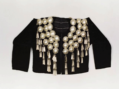 民族文化宮博物館收藏的這件銀飾“孔雀衣”,是景頗族女子盛裝時的一種服飾,征集于云南省德宏傣族景頗族自治州隴川縣,時間為20世紀50年代。這件銀飾“孔雀衣”長40厘米,胸圍108厘米,黑色平絨布制作而成,圓領對襟,領部、肩部和胸部墜銀泡、銀鏈、銀穗裝飾,黑白兩色相映成趣,精致華美。銀泡為三圈,由里至外逐圈增大,里層銀泡直徑約2厘米,最外層銀泡直徑約3厘米。外圈銀泡每個上墜有三角型銀片打制的銀穗,每串分三層,每層分別掛2、4、6個不等的三角型銀片。整個上衣幾乎被銀泡、銀鏈和銀穗遮蓋,穿上銀飾“孔雀衣”,銀泡在太陽的照射下銀光閃閃,行動起來身動銀搖,悅耳動聽。