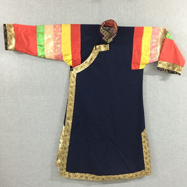 民族文化宮博物館收藏的這件立領(lǐng)右衽大襟五色袖“彩虹衣”,是土族女子盛裝時的一種服飾,征集于青海省互助土族自治縣。年代為20世紀30年代?!安屎缫隆遍L117厘米,胸圍120厘米,袖長59厘米,棉質(zhì)。整件女服右衽大襟,藍棉布襯里,左右側(cè)開衩,黑色“拉花”立領(lǐng),領(lǐng)上以土族傳統(tǒng)刺繡工藝—盤繡刺繡紅綠相間圓形圖案和辮形線條,綴三枚金色圓銅扣。衣袖為紅、黃、綠、白、粉五色彩布、彩緞拼接的“彩虹袖”,其中紅色為主色,占整個衣袖約一半面積,其余四色布塊相鄰,均勻分布于衣袖上方,布塊上刺繡有金色梅、蘭、竹、菊圖案。衣袖袖口鑲寬約3厘米黑色絲絨底刺繡花邊,花邊里外均繡有花草紋樣,做工精致?;ㄟ吷辖訉捈s10厘米金色牡丹紋花邊,與襟邊、下擺、衩口等處所貼金色牡丹紋花邊相互呼應,極富設(shè)計感。