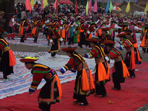 不同地區(qū)的土族舞蹈具有相對獨立性,互助的“安昭”、民和的“納頓”、大通的“踏灰”、同仁的“於菟”、甘肅卓尼的“嘎爾”等是最具代表的民間舞蹈。“安昭”,土語稱之為“千佼日”,意為“彎曲”或“轉(zhuǎn)圈”,是土族民間喜慶節(jié)日和婚禮儀式中,用于禮贊祈祝的一種圓場群舞,也是一種歌舞結(jié)合、無樂器伴奏的集體舞蹈。一般由男女各半圍成圓圈,由一男子帶領,一唱眾和。舞蹈動作簡單質(zhì)樸,舞者兩手由右胯旁起向左上方至右上方劃圓弧,變?yōu)樽笫智谀X前,右手高居于后,似雄鷹翱翔于藍天?!办遁恕蔽杓椿⑽琛!办遁恕?,是古代楚人對虎的方言稱謂。每年農(nóng)歷十一月二十日祭山神時,名為於菟的舞者在赤裸的上身繪制虎豹圖案,模仿虎的形象“前端腿跳”舞蹈,達到祀神驅(qū)邪、祈求平安的目的。