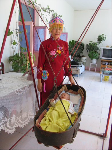 錫伯族的誕生禮在人生諸禮中占有重要位置,而且持續(xù)時間也比較長,包括產(chǎn)前的求子習(xí)俗、孕期習(xí)俗,以及分娩習(xí)俗和子女養(yǎng)育習(xí)俗。為慶賀孩子的出生,要為他(她)舉行嬰兒祝吉禮,主要包括起名禮、滿月禮、周歲禮。男女新生兒的誕生儀式有所差異。傳統(tǒng)觀念認(rèn)為生男是“弄璋”之喜,表示尊貴,要大慶賀;生女為“弄瓦”之喜,表示卑順,儀式從簡。