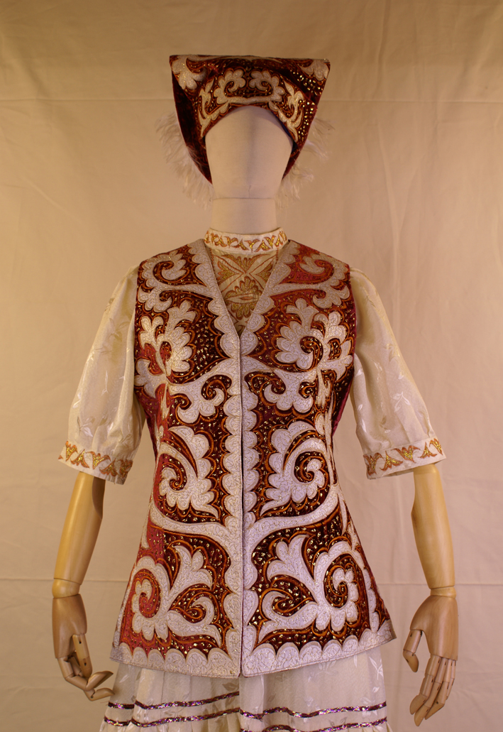 俄羅斯族女性的服飾則更多的體現(xiàn)了女性美,她們在重大節(jié)慶或節(jié)日時會穿上絲綢質(zhì)地的繡花襯衣,外面再套穿一件無袖、腰身較高的對襟長衫,下身一般穿著毛織長裙。俄羅斯族女子也十分喜愛穿長筒皮靴或氈靴。俄羅斯族女性的發(fā)飾也視年齡的不同而有所差異,少女梳獨辮,把彩色發(fā)帶和小玻璃球編在辮子里,頭發(fā)可外露。已婚婦女則梳兩條辮子,盤于頭頂,再用頭巾或帽子罩上。
