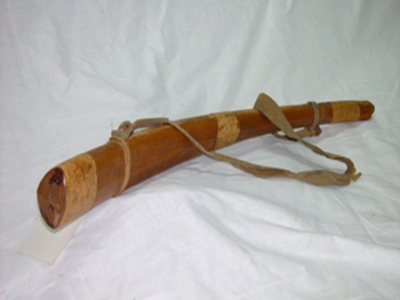 民族文化宮館藏鹿哨為紅松木質(zhì)地,牛角形,長71厘米,中間鏤空,以細(xì)鱗魚皮熬膠粘合,頭部細(xì),尾部粗并呈喇叭狀;在頭、尾、中間箍3道箍,在接近頭尾的兩端纏細(xì)皮繩為環(huán),環(huán)上系寬皮帶,便于出獵時背挎于肩或平時置放時懸掛。