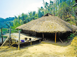 云南省潞西市三臺山鄉(xiāng)的德昂族居住分散,村寨很小,大都建在高半山上,山路行車困難。傳統(tǒng)住房為正方形干欄式竹木建筑,房屋兩層,為木柱結(jié)構(gòu)框架,竹篾編片圍墻,粗竹劈壓成自然的竹片做樓板,屋頂苫草排,當(dāng)?shù)厮追Q“草帽頂房?!?/p>