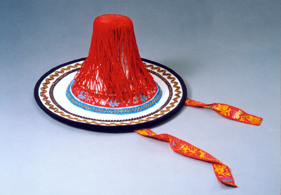 帽子是姑娘和已婚婦女的區(qū)別標(biāo)志。姑娘不戴帽子,前額戴“沙日達(dá)什戈”。這是一條寬約三寸長(zhǎng)約一尺,下邊緣用紅色或白色珊瑚小珠穿縫許多珠穗的紅色布帶。已婚婦女身穿高領(lǐng)偏襟長(zhǎng)袍,一般由綢、緞、布、褐、皮料縫制。衣領(lǐng)高齊耳根,袍子一般以綠、藍(lán)色為主,但也有深紅、紫紅等顏色。袍子下擺兩邊開(kāi)衩,衣袖口至肘部用各色織錦緞、彩綢、彩緞花邊一圈圈縫綴裝飾。腰系腰帶(裕固族也叫“胡兒”,即系腰),主要是桃紅色或綠色,長(zhǎng)袍上面罩一件高領(lǐng)偏襟坎肩,但也有無(wú)領(lǐng)偏襟坎肩。