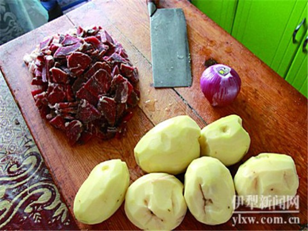 拜列西的做法有很多種,其中以用羊肉、洋蔥、土豆或南瓜為主要食材的伊提拜列西(肉拜列西)和以蘋果為食材的阿勒瑪拜列西(蘋果拜列西)為主。羊肉切薄片,土豆切小方塊,洋蔥切丁,倒在一起,擱置一旁,開始和面。和面是制作拜列西過程中一項至關(guān)重要的環(huán)節(jié),面和得好壞直接會影響到烤出來的拜列西的美觀程度和口感的酥脆程度。