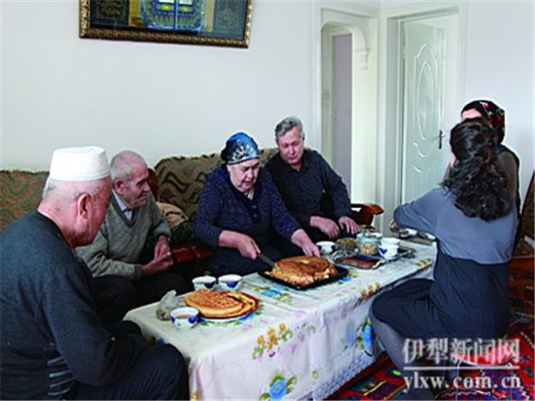 整個制作過程,兩個老人有一搭沒一搭地聊著天,準(zhǔn)備食材,互相搭把著手。屋外客廳里,她們的丈夫一邊看著電視一邊等,其樂融融,倒讓人感覺到一種歲月靜好的美感。待屋子里到處都飄蕩著拜列西濃烈誘人的香味時,大家的味蕾都被調(diào)動起來。就在這當(dāng)兒,買斯胡旦的弟弟帶著弟媳也來了。兩口子熱鬧,一開門,爽朗的笑聲就飄進(jìn)門。弟媳說:“嗨,我這兩個姐姐手可是巧得很!”弟弟說:“做了這么好吃的東西,沒人來吃怎么能成!”