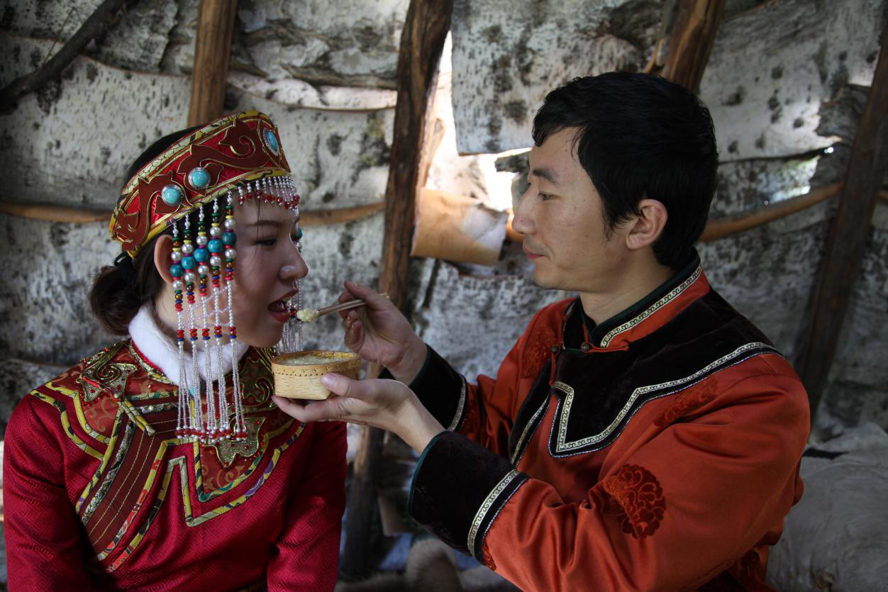 婚期來(lái)臨,男方同族兄弟姐妹組成聲勢(shì)浩大的接親馬隊(duì),簇?fù)碇吕汕巴降募依镉⑿履?。新娘進(jìn)入男方“烏力鄰”的時(shí)候,男方父母捧出美酒敬獻(xiàn)送親的新娘長(zhǎng)輩,然后雙方的長(zhǎng)輩被請(qǐng)到預(yù)先設(shè)置好的婚禮場(chǎng)地就坐,新郎新娘在主持人的引導(dǎo)下跪拜南天,新娘拜見(jiàn)公婆,新郎新娘跪拜所有長(zhǎng)輩?;檠玳_(kāi)始前,男方家長(zhǎng)要向火神敬獻(xiàn)酒肉?;檠缰?,新郎新娘吃肉要用一個(gè)盆盛,用一刀割,酒也要用一個(gè)碗喝,象征夫妻同甘共苦、永不分離。次日晨,新郎新娘要向出生的太陽(yáng)磕頭祈禱,祈求太陽(yáng)給他們溫暖,讓他們幸福。早餐后女方送親的人準(zhǔn)備返回,新郎新娘要向它們敬酒送別,祝他們一路平安。女方親友喝完餞行酒后,往往把酒杯揣入懷中,催馬疾馳而去,男方親友紛紛跨馬急追,想方設(shè)法將酒杯奪回來(lái),否則認(rèn)為是男方無(wú)能。