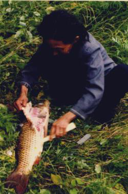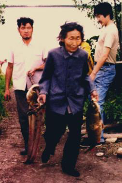 圖八 圖九 赫哲族婦女用木鍘刀熟魚皮 將熟好的魚皮連成大片