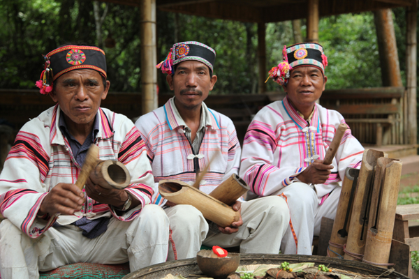 男子身著無(wú)領(lǐng)對(duì)襟上衣,多用白底直條紋土布制成,背部縫有繡在白色方塊布上的月亮花圖案。下穿寬大的褲子,長(zhǎng)及膝處,用白色土布綁腿。頭上留三撮發(fā),額前正中一撮,頭頂腦門(mén)心兩邊各一撮,但有的村寨只留一撮,有的在額正中,有的在頭頂上,長(zhǎng)約寸許,用寬一尺、長(zhǎng)丈余的黑布纏頭。