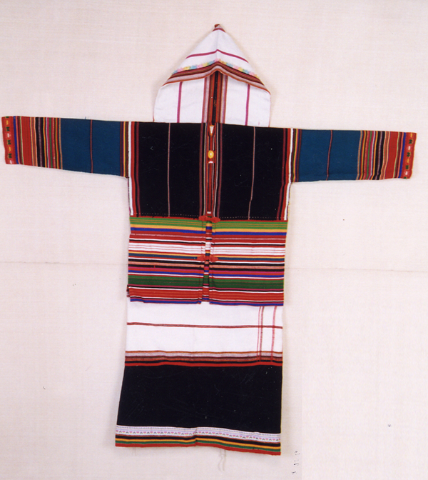 基諾族婦女上衣為無(wú)領(lǐng)對(duì)開(kāi),上半部多采用黑布或白布,下半部及衣袖用紅、藍(lán)、黃、白等7色布配制或刺繡而成,用紅色鑲邊,上衣背部縫一塊約3寸見(jiàn)方的白布,上面繡有圓形太陽(yáng)花式圖案(基諾族稱(chēng)月亮花);內(nèi)衣為上部呈方形下呈菱形的兜肚式緊身衣,上部方形為鮮艷的條飾花紋,下部菱形繡著各式圖案。下身多著紅色鑲邊的黑色合縫短裙,并用一尺左右的黑布纏綁小腿。發(fā)型為椎髻,婚前髻在腦后右方,婚后髻在前額正中。頭戴披風(fēng)式尖帽,這種尖帽用長(zhǎng)約60公分、寬23公分的豎線(xiàn)花紋土布對(duì)折,縫住其一邊而成,戴時(shí)又在帽沿上折起一指許的一道邊。