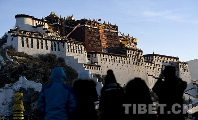 圖為2月5日,游客在藥王山觀景臺(tái),迎接新年第一天第一縷陽(yáng)光灑向布達(dá)拉宮。
