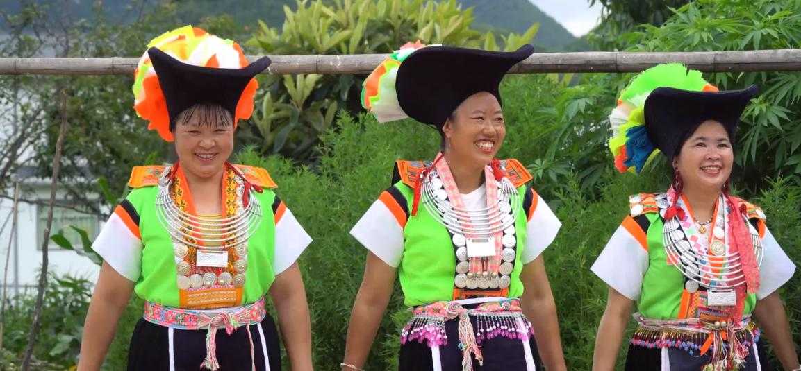 五星村苗族女性服飾顏色亮麗,做工精細(xì)。女子頭戴黑色百褶帽,百褶帽形似一只船,在其尾部還裝飾有用絲巾制作而成的花朵。上身則多以黃綠色打底的對(duì)襟短衣,對(duì)襟處繡有花紋圖案作為描邊,對(duì)襟上裝有銀飾圓牌。女子胸前還大多佩戴銀項(xiàng)圈,身后則穿戴背牌。背牌做工極為精細(xì),刺繡圖案豐富。圖案多以幾何和花草為主,背牌上部裝飾有兩排對(duì)稱(chēng)的銀牌,左右也裝飾有對(duì)稱(chēng)的銀鎖。背牌中部是一個(gè)倒三角銀飾,銀飾上雕刻有蝴蝶圖案。女性服飾下裳主要分為三個(gè)部分,底部為黑色打底長(zhǎng)褲,中層為黑色打底的百褶裙,上層則為黑色打底的圍腰。圍腰底部繡有花紋圖案裝飾,圖案內(nèi)容多以花草為主。腰部系有腰帶,腰帶上刺有花紋圖案且顏色較為鮮艷。女性服飾身后還垂有四條絲帶,絲帶上也繡有大面積的花紋圖案,服飾整體充滿(mǎn)民族氣息。