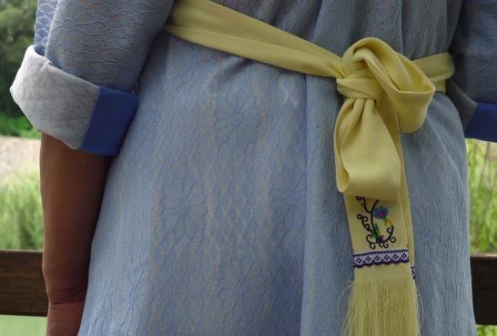 斜襟短衣外的圍腰上部與斜翼兩側(cè)鳥獸花紋,圍腰大部分為純色,色彩選擇較多。而垂在腰后的彩帶尾部有流蘇,助以美觀和裝飾。