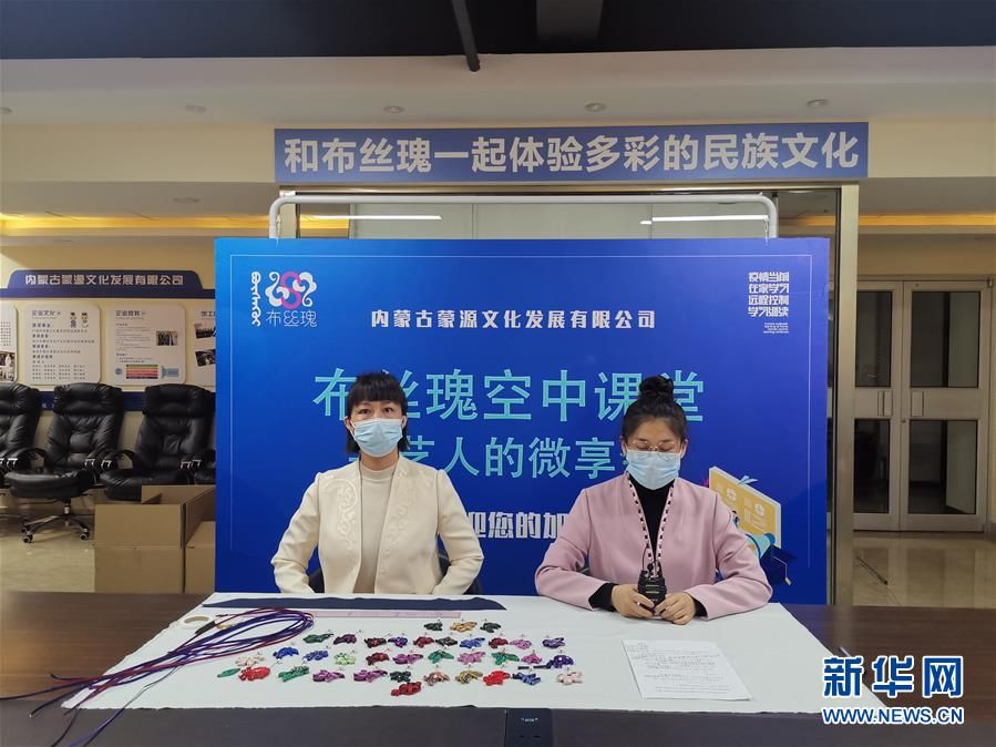 工藝師孫亞杰(左)通過(guò)空中課堂為內(nèi)蒙古各地的近500名婦女講授盤(pán)扣制作工藝。