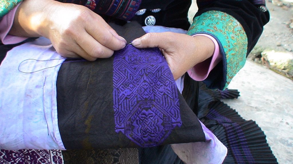服裝的挑花刺繡均是依照布料的經(jīng)緯戳針,在繡法上多有變化,如平繡、數(shù)紗繡、織繡等,其紋樣層層疊套,圖案工整對稱,其繡技與織技完美統(tǒng)一,巧奪天工,具有很強的立體感。體現(xiàn)了苗族獨特的正挑反針挑花、刺繡、織繡等精湛工藝。