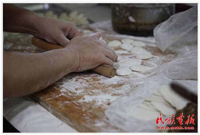 店內(nèi)師傅正在搟制燒麥面皮