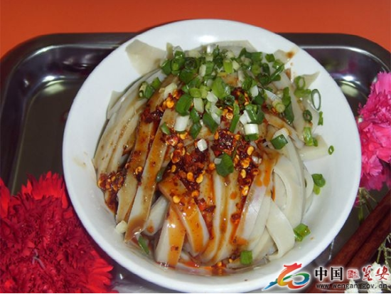 貴州甕安的豌豆涼粉獨(dú)具特色,歷史悠久,據(jù)說(shuō)它的產(chǎn)生也有200年歷史。豌豆涼粉制作特別,工序多、時(shí)間長(zhǎng),技術(shù)十分精巧。它的原料是豌豆,吃豌豆涼粉之所以考究就在于它不用醬油,也不直接放食鹽調(diào)味,而是用特別的加了鹽的風(fēng)豆豉醬。食用時(shí),可用刀切成條、塊、片、絲狀盛在碗里,配以蔥花、姜米、蒜水、紅油辣椒和風(fēng)鼓醬涼拌即可。