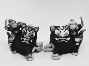 泥叫虎是山東高密的一種民間泥塑,起源于明代萬歷初年,是形、色、聲、動(dòng)俱佳的民間工藝品,與撲灰年畫、剪紙并稱為“高密三絕”。泥叫虎腰部由牛皮連接,擠壓其頭部和尾部后,會(huì)發(fā)出響聲,叫虎一名由此而來。河南也有叫虎,又稱皮老虎。相較之下,山東的泥叫虎更具特色,而且在藝術(shù)風(fēng)格上更大氣,樣式憨態(tài)可掬,哨子發(fā)出的聲音也十分有趣。