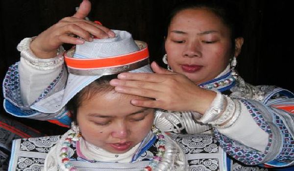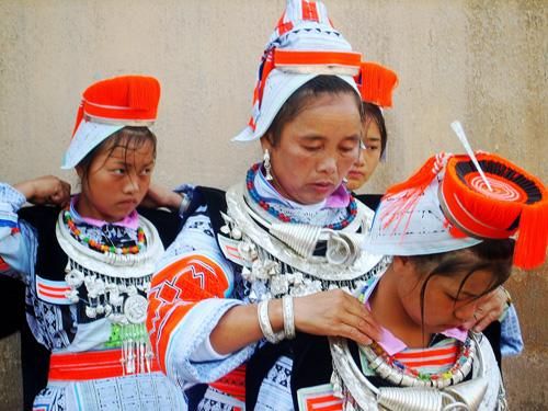圖為革家姑娘在接請(qǐng)姑媽過(guò)“十四”前,母親總要為女兒作一番打扮