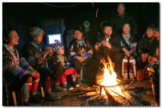 苗族起木樓很注重火塘的設(shè)置,特別留出二樓正中的大半廂作火塘?;鹛劣脤捄窭仙寄景彖傊瞥梢粋€(gè)長(zhǎng)寬約一點(diǎn)五米,深約六十公分的正方形木槽,槽內(nèi)用粘性強(qiáng)的黃泥巴填滿舂緊,正中央安放有三腳鐵架,用于架鍋煮食?;鹛潦侵蟪浴⑦M(jìn)餐、取暖、會(huì)客、議事、祭祀的地方,又是年輕人走妹行歌、談情說(shuō)愛(ài)、舉行婚禮儀式的場(chǎng)所。因此苗家人對(duì)火塘是十分看重的。