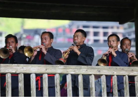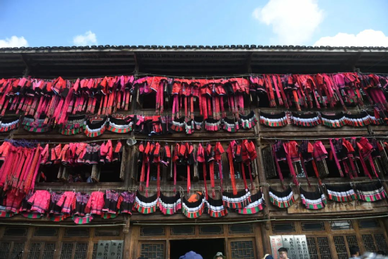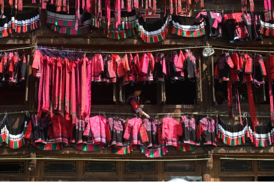 這一天,寨子里賓客盈門熱鬧異常,嫁出去的女兒和在外寨入贅的兒子都要挑著鴨子、酒和禮品,背著小孩回家吃團圓飯,家家戶戶包粽子過大節(jié)。紅瑤姑娘和嫂子們,紛紛推開窗戶,拿出民族盛裝一件件掛在窗外晾曬,整個寨子掛滿了紅衣服,顯得格外鮮艷奪目。