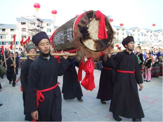 第6天(申日):下午兩三點鐘,保管銅鼓的寨老等人,燒香化紙,燃放鞭炮,用魚、肉、酒等祭鼓后,先由寨老家人踩幾圈銅鼓,然后全寨男女老少及來客(主要為女青年)跟著踩。這天,人人穿著節(jié)日盛裝,在蘆笙的伴奏下,踏著鼓點,圍圈跳蘆笙銅鼓舞。晚夜,本寨和外寨未婚男女青年在河灘等地“游方”,對唱情歌,尋覓伴侶。每天晚上的“游方”活動持續(xù)到第10天(子日)才結束,這時外寨的男女青年才依依不舍離去。