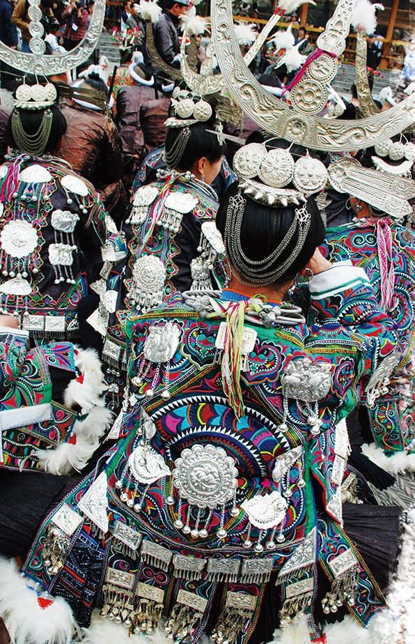 亳無疑問,蝴蝶圖騰即是對蠶的崇拜,蠶文化原初的核心便是人歸途的儀式,人要在這種和蠶一祥的儀式中得到再生。今天的苗族,仍然保持著以絲綢裹身而葬的喪葬習(xí)俗。我祖母養(yǎng)蠶織就的絲織品,我們習(xí)慣稱作蠶絲床單,絕大部分是備著喪葬所用。凡有人去世,主客必送一床蠶絲單,沒有是不行的,被視為不懂禮節(jié),而死者獲得蠶絲單越多越好。有的人家收到的蠶絲單過多,就會保存一部分,留著將來的喪事送禮。苗族每個人都必備一件絲質(zhì)壽衣。并且,在許多重大的儀式活動中必須要著絲綢服裝。比如在苗族重大的鼓藏節(jié)期間,鼓社頭必須穿絲織鼓社服;大祭典活動時,祭師也必須穿絲質(zhì)服裝等等。