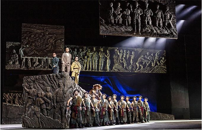 在舞蹈語言的設計上,編導融入當代元素,使觀眾不但感受到審美的親切與現(xiàn)代感,而且還自然地進入回望歷史的情境,對其思想內涵的理解更為準確。該劇的道具使用和調度也頗為大氣,令人印象深刻。一組斜坡狀的大型舞臺道具不但由群眾演員直接移動而實現(xiàn)即時的場景調度,還可使演員上下和左右而行,最終組合成巨大的中國共產黨黨徽,輔助完成了人民英靈和英雄的形象塑造。