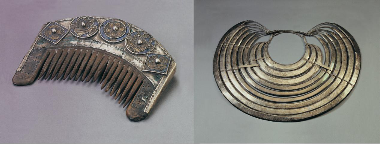 廣西龍勝侗族清代鑲銀嵌花木梳和湖南通道侗族民國(guó)時(shí)期九層銀項(xiàng)圈