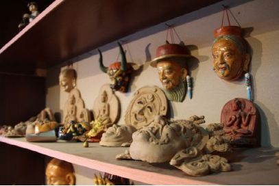 在普布次仁所在的公司里,有一個(gè)專門用來(lái)制作泥塑面具的房子,從外表上看去,它只是一個(gè)普普通通的藏式民居,但走進(jìn)其中,則別有一番天地。在房間里整齊擺放了大大小小的泥塑面具、佛像,這些手工藝品造型生動(dòng),每一件手工藝品仿佛都在訴說(shuō)著一個(gè)古老、動(dòng)人的故事。