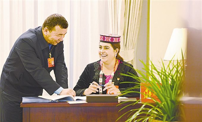 黨的十九大新疆代表團(tuán)駐地里,米日姑麗·艾克米汗和吾布力喀斯木·買(mǎi)吐送代表(維吾爾族)談起五年來(lái)家鄉(xiāng)的巨大變化非常開(kāi)心,“百姓富了,家鄉(xiāng)美了,來(lái)自全國(guó)的客人也多了” (高興貴 攝影)