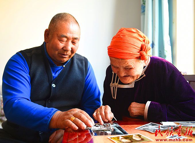都貴瑪(右)和扎拉嘎木吉在翻看老照片。(新華社記者 鄧華 攝影)