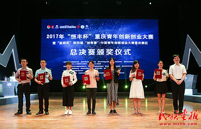 鐘億靈(右二)參加重慶市創(chuàng)新創(chuàng)業(yè)大賽并榮獲一等獎。