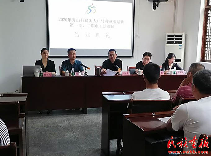 2020年6月29日,鐘億靈(左一)出席在清溪場鎮(zhèn)武陵山致富帶頭人實訓基地舉行的秀山縣2020年貧困人口轉移就業(yè)培訓第一、二期電工培訓班結業(yè)典禮。(秀山縣人民政府網(wǎng))