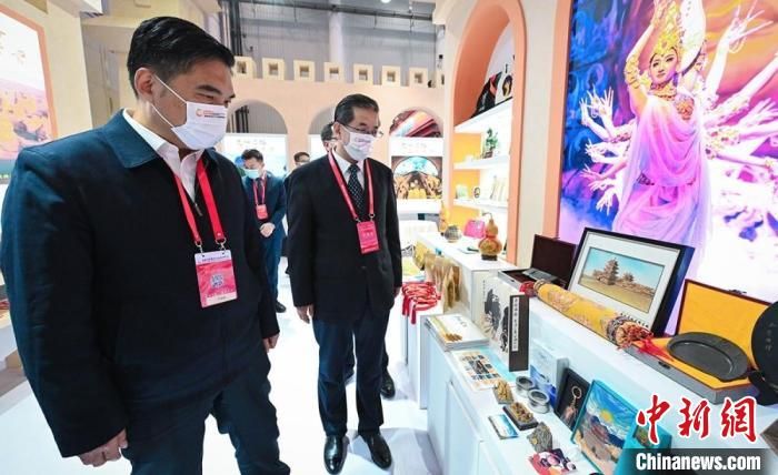 圖為甘肅省副省長孫雪濤(左)與甘肅省文化和旅游廳廳長陳衛(wèi)中(右)一同參觀“甘肅館”?!「拭C省文化和旅游廳供圖