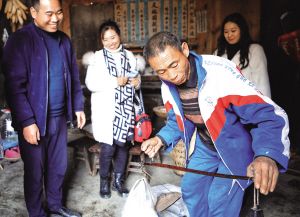 在村里修復(fù)舊屋的趙貢彩接到游客電話,馬不停蹄地趕回家中,自家手工制作的苕粉成了游客心心念念的香餑餑。拿出早已生銹的秤桿,一袋袋苕粉被游客搶著購買?!岸际橇糁约页缘模南胫苜u出去喲?!毙χf罷,趙貢彩拿出手機(jī),微信一掃,錢款立即到賬。