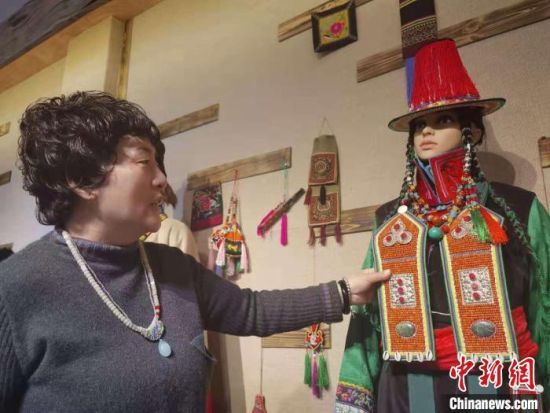 圖為柯璀玲介紹收藏的裕固族服飾?!∈缝o靜 攝