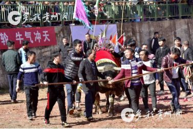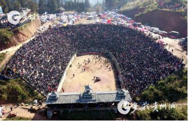 貴州省從江縣第十五屆原生態(tài)侗族大歌節(jié)的前一天,恰逢該縣逢亥斗牛日,丙妹鎮(zhèn)松學(xué)斗牛塘、谷坪鄉(xiāng)四寨河斗牛塘同時(shí)舉辦傳統(tǒng)牛王爭(zhēng)霸賽,喜迎一年一度“侗族大歌節(jié)”的到來,共有來自周邊村寨的80頭水牯牛參戰(zhàn),斗牛活動(dòng)場(chǎng)上名牛角逐,場(chǎng)面異彩紛呈,吸引數(shù)萬名觀眾前來觀戰(zhàn)。