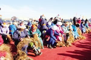 當(dāng)然,后來(lái)那達(dá)慕增加了許多新項(xiàng)目,比如賽駱駝、提水、縫蒙古袍扣子、撿牛糞、打斷牛骨比賽、蒙古象棋比賽、沙嘎(羊拐)比賽等。在北京舉辦的那達(dá)慕里,還融入了現(xiàn)代三大球類比賽項(xiàng)目,為了集體參與,增加了拔河比賽、扔沙包、服飾比賽、兒童說(shuō)蒙古語(yǔ)比賽、兒童唱歌比賽等。