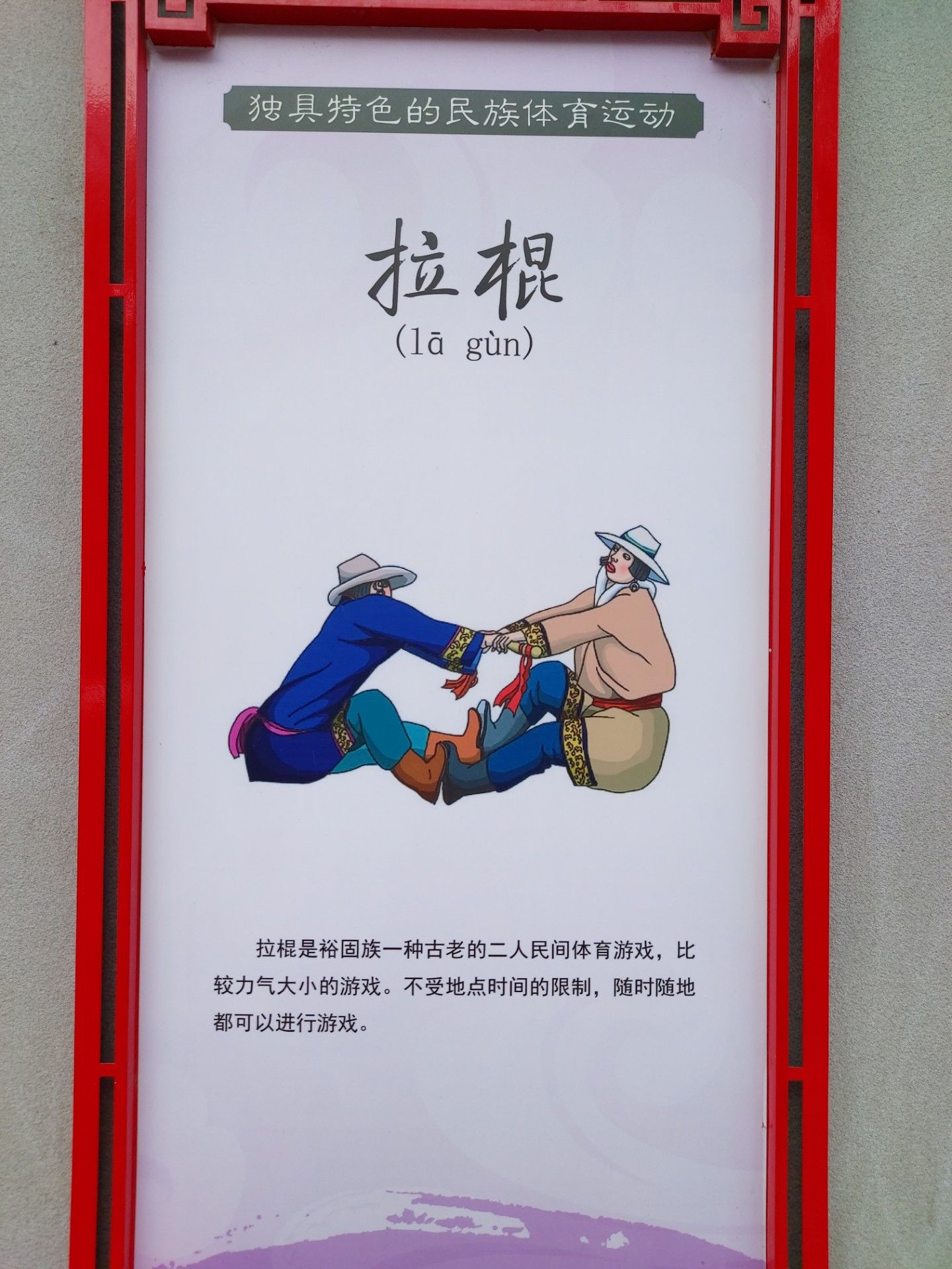 拉棍是裕固族一種古老的二 人民間體育游戲,比較力氣大小的游戲。不受地點(diǎn)時(shí)間的限制,隨時(shí)隨地都可以進(jìn)行游戲。