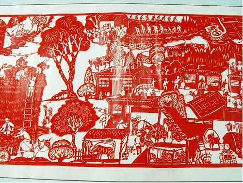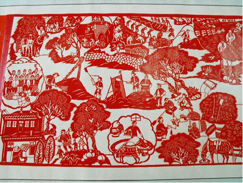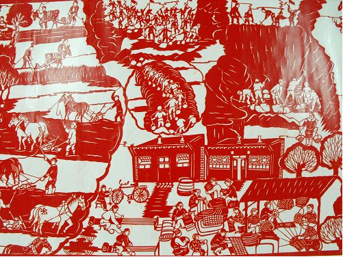 2、達(dá)拉特紀(jì)事剪紙的歷史價(jià)值很高,《農(nóng)民紀(jì)事圖》上卷記載了從建國到現(xiàn)在農(nóng)村的發(fā)展變化,在作品中我們看到了很多瀕臨失傳的農(nóng)村生產(chǎn)生活工具和生產(chǎn)方法,也能看到黨和國家在每一年出臺(tái)的各項(xiàng)惠農(nóng)利民政策,對(duì)于研究歷史具有重大的文獻(xiàn)價(jià)值。
