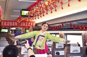 沈佳高鐵長白山至敦化段開通運營,將促進沿線旅游業(yè)和冰雪經(jīng)濟快速發(fā)展,進一步加強民族團結,助力長吉圖開發(fā)開放、深度融入 “一帶一路”。圖為列車工作人員在車內(nèi)表演朝鮮族歌舞。 新華社發(fā)