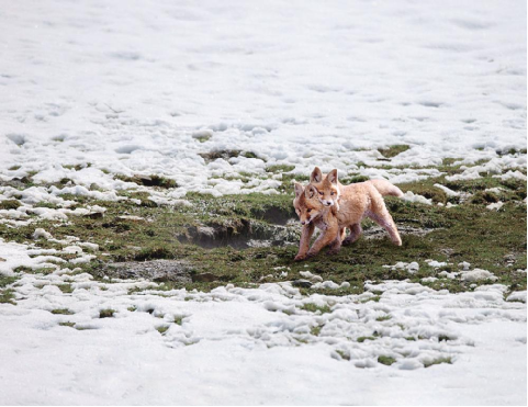 藍天白云,微風輕漾;草地碧綠,鳥語花香。大自然的美景圖正在小赤狐的家園四周徐徐展開。在膽大的小赤狐的叫喚聲里,躲在洞內(nèi)的另外兩只小赤狐也壯著膽子探出頭來。不一會兒,它們習慣了周圍的環(huán)境,三只小赤狐在離洞口5米遠的范圍內(nèi)嬉戲玩耍著。它們時而跳躍,時而奔跑,展現(xiàn)出本能的捕獵動作。稍大一點的小赤狐騎在小一點赤狐的背上嬉戲玩耍,小赤狐也不示弱,奮力反擊,猶如兒童打鬧,其樂無窮。那烏黑溜圓的眼睛彎了又彎,毛茸茸的尾巴高高地翹起,身體嬌小,惹人喜愛,讓人看了會產(chǎn)生想上去抱一抱、摸一摸小赤狐身軀的念頭。