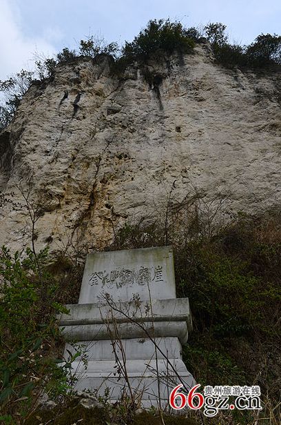 金山洞摩崖是貴陽市花溪區(qū)最早的摩崖石刻,也是貴州最早的摩崖石刻之一。該摩崖石刻位于燕樓鄉(xiāng)東北三里的金山洞巖壁上。其山上豐下儉,古人利用自然山形,在可避風(fēng)雨的洞壁上摩巖、題刻賦詩作畫。整個(gè)摩崖面積通高140厘米,寬74厘米;自右至左豎行排列,共6行82字。據(jù)系楷書陰刻,書法古樸流暢,具有較高的歷史價(jià)值。