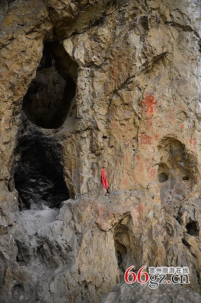 同時(shí),在金山洞壁上的清代壁題也數(shù)量眾多,既有題詩,又有紀(jì)事,還有祝文,分別題于清乾隆、道光、咸豐年間。明顯可見“貴州貴陽府”和“貴陽府廣順州”等字樣。還有1949年以后的毛主席語錄,均以赭色書寫。據(jù)說時(shí)至今日,仍有村民在巖下洞口焚香秉燭,寄拜巖神,祈禱康健?,F(xiàn)在在巖石上還能看到祈福的紅布和被煙火熏黑的巖洞。