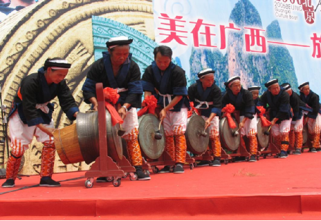 銅鼓舞,在廣西都安、巴馬、東蘭、馬山一帶的瑤族地區(qū)盛行。每年農(nóng)歷五月二十九過“祝著節(jié)”(年節(jié)),要敲12天銅鼓,表示懷念祖宗和預祝豐收。節(jié)日隆重,聚眾數(shù)以千記。跳舞時,用銅鼓一對,其意一雌一雄,公聲小,母聲大。由兩男敲擊,兩男持雨帽回環(huán)擊鼓者扇搖,還有兩男兩女,應鼓樂節(jié)奏翩翩起舞,舞姿雄健優(yōu)美,氣氛熱烈,十分感人。