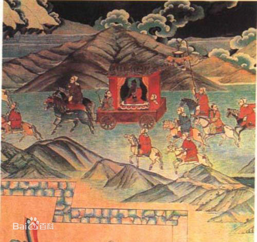 貞觀15年(641)正月十五,唐太宗將文成公主下嫁松贊干布,詔令江夏王李道宗持節(jié)護送。文成公主在唐送親使江夏王太宗族弟李道宗和吐蕃迎親專使祿東贊的伴隨下,前往吐蕃。文成公主一行從長安出發(fā),途經(jīng)西寧,翻日月山,長途跋涉到達拉薩。 松贊干布率群臣到河源附近的柏海(今青?,敹嗫h境內(nèi))迎接文成公主,謁見李道宗,行子婿之禮。之后與公主同返邏些(今拉薩),為公主筑城、修建宮室。