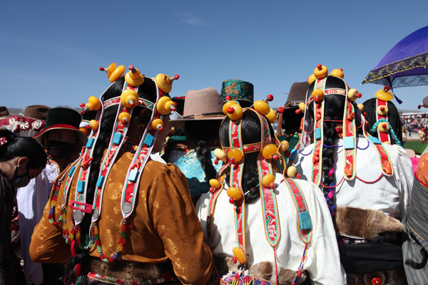 藏族婦女發(fā)飾因地域之別而顯得豐富多彩。西藏部分地方的婦女喜戴巴珠,拉薩附近的婦女所戴三角形巴珠,平系與頭頂,兩枝向前,將分梳的兩條發(fā)辮分別盤在兩枝上。日喀則、江孜一帶的婦女戴弓形巴珠,弓背向上,梳成多條的發(fā)辮分別掛在弓的兩端。貴重的巴珠上面鑲有珊瑚、瑪瑙等,顯得富麗堂皇。姑娘一戴巴珠,就意為著長大成人,因此,第一次戴巴珠時(shí),家中要為姑娘舉行傳統(tǒng)的成人儀式。